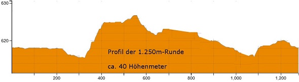 Dieser Anstieg überwindet auf 100m Länge ca. 10 Höhenmeter, wobei der Anstieg von Runde zu Runde tiefer wird. Die nächsten 100m gehen weiterhin ganz leicht bergauf. Dann geht es endlich in einer langgezogenen Linkskurve bergab in Richtung Beachvolleyballplatz.