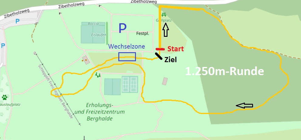Vor dem Beachvolleyplatz geht es rechts auf die 600m-Runde. Nun führt die Strecke über eine lang gezogene Linkskurve nach oben. Oben auf dem Wiesenplateau geht es gleich wieder bergab. Jetzt läuft man über Rindenmulch zum Skihang. Die Querung über den Skihang, der hier leicht nach rechts hängt, führt leicht berghoch. Danach geht es leicht bergab zur Lifttrasse. Nach der Überquerung der Lifttrasse kommt eine langgezogene 180°-Rechtskurve. Es geht wieder über die Lifttrasse und über lang gezogene Kurven zurück zum ersten Wiesenabschnitt. Dort geht es die letzten 50 m leicht bergab ins Ziel bzw. zur Wechselzone.